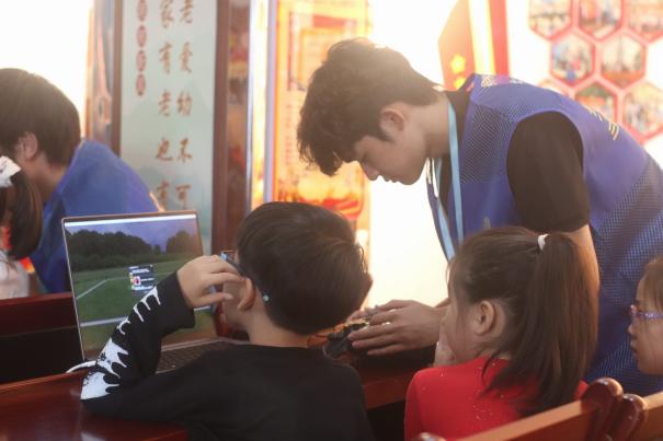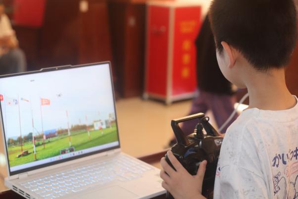 在理论知识“充电”完毕后,活动进入了最受期待的实践操作环节。现场特别设置了无人机模拟器和足球无人机两项体验环节。在模拟器体验环节中,孩子们轮流上阵,在专业指导下学习使用遥控器进行起飞、悬停、转向等基础操作。模拟器提供了一个零风险的试错环境,让孩子们能够快速掌握操控要领,建立飞行信心。