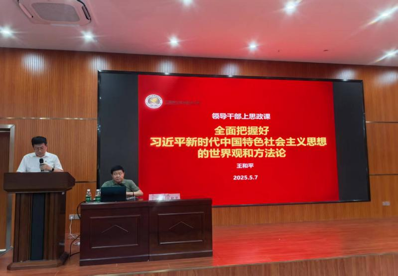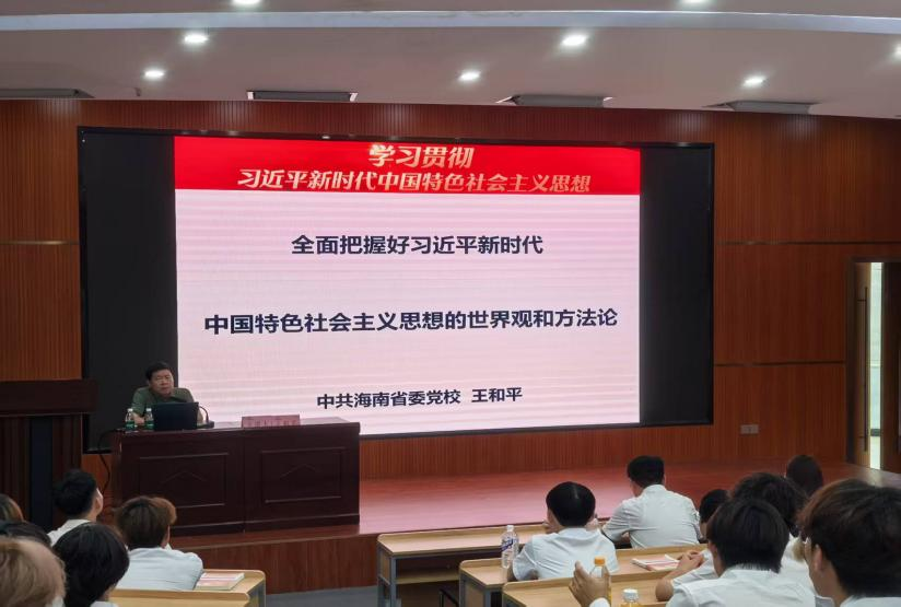王教授通过两个核心板块展开论述:一是系统梳理马克思主义发展脉络,阐释习近平新时代中国特色社会主义思想的理论渊源;二是深度解读“六个必须坚持”方法论体系,结合中美贸易摩擦、海南自贸港建设等典型案例,剖析这一思想体系的实践价值。王教授的授课既有理论纵深,又立足现实需求,运用丰富数据图表和时政热点进行论证分析。